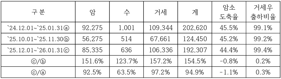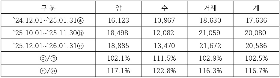최근 2개월간(`25.12.01~`26.01.31) 한우시세는 경기침체와 소비자 물가 상승으로 인한 소비위축과 도축두수 증가로 인한 공급량 증가에도 불구하고, 군 급식, 학교급식, 각종 연말연시 행사 모임, 유통업체 설 선물 세트 준비, 설맞이 온라인 한우장터 및 설맞이 한우 할인판매 행사 판매 물량 준비 등으로 인한 수요 증가의 영향으로 지난 2개월대비 약강세를 보였다.