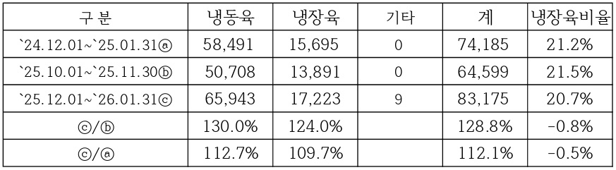 최근 2개월간 쇠고기 수입량(검역기준)은 83,175톤으로 지난 2개월대비 128.8%로 28.8% 증가하였으며, 전년동일기간대비도 112.1%로 12.1% 증가하였다. 냉장육 비율은 20.7%로 지난 2개월 대비 0.8% 감소하였으며, 전년동일기간대비도 0.5% 감소하였다.