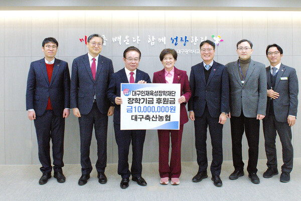 최성문 대구축협 조합장(왼쪽 세 번째)이 대구시 교육청에 장학금을 기탁하고 있다. 대구축산농협(조합장 최성문)은 최근 대구광역시교육청을 방문해 장학기금 1000만 원을 기탁하며 지역 인재 육성을 위한 뜻깊은 나눔을 실천했다. 이번 장학금 기탁은 대구축산농협이 추진 중인 ‘지역사랑 나눔운동’의 일환으로, 지역 학생들의 학업 지원과 인재 육성에 보탬이 되고자 마련됐다. 대구축협은 매년 장학금을 기탁하며 지역사회와의 상생을 꾸준히 실천하고 있으며, 사랑의 김장김치 나누기와 생활물자 지원 등 다양한 사회공헌 활동도 함께 전개하고 있다. 최성문 조합장은 “경제적으로 어려움을 겪는 학생들이 꿈과 희망을 잃지 않고 미래를 준비할 수 있도록 지속적인 관심과 지원을 이어가겠다”라고 밝혔다. 강은희 대구시교육감은 “매년 지역 학생들을 위해 따뜻한 나눔을 실천해 주시는 대구축협에 감사드린다”라며 “기탁된 장학금은 지역 인재 육성을 위해 소중히 활용하겠다”라고 밝혔다. ※ 출처 : 축산경제신문( https://www.chukkyung.co.kr/news/articleView.html?idxno=79452 ) |