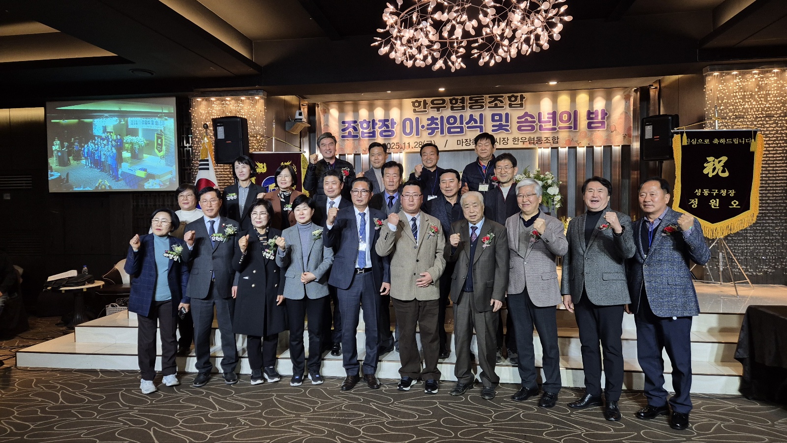 우리 협회는 11월 28일(금) 서울 성동구 소재 레노스블랑쉬에서 개최된 마장축산물시장한우협동조합의 '제3, 4대 조합장 이취임식'에 참석하였다. 금번 이취임식에는 본회 김용철 회장을 비롯하여 축산물유통단체협회의 회원들인 한국축산물처리협회, 축산기업중앙회, 한국식육운송협회, 한국계란산업협회 단체장 및 임원들이 참석하여 자리를 빛내주었다. 3대 조합장인 심판식 조합장은 이임사를 통해 그동안 많은 협조를 해주었던 조합원들에게 감사인사를 전하며 4대 조합장에게도 많은 힘을 실어주기를 당부하였다. 금번 4대 조합장으로 선출된 손영호 조합장은 취임사를 통해 마장동 한우시장 발전을 위해 최선의 노력을 다하겠으니 조합원 여러분들의 많은 협조와 격려를 부탁하였다.