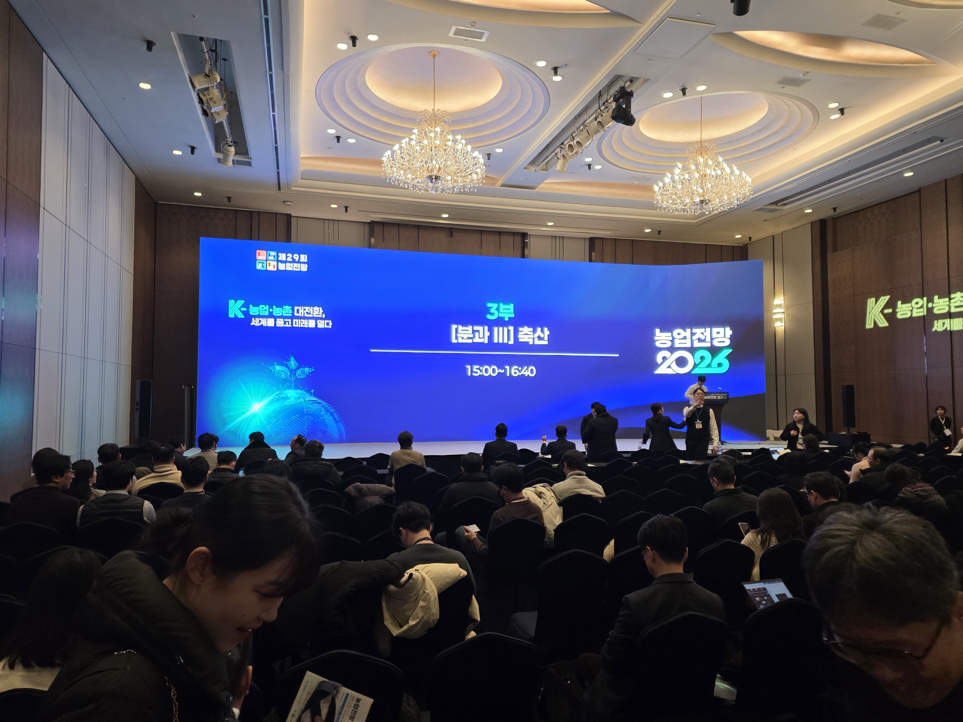 우리 협회는 한국농촌경제연구원 주최로 ‘농업․농촌 대전환, 세계를 품고 미래를 열다’라는 대주제 아래 1월 22일 잠실 롯데호텔월드 크리스탈볼룸에서 개최된 ‘농업전망 2026’에 참석하였다. 제1부 농정 방향과 한국 농업.농촌 미래에서는 김용렬 농업관측센터장의 ‘2026년 농업 및 농가경제 동향과 전망’, 농림축산식품부 박순연 기획조정실장의 ‘2026년 주요 농정 방향’에 대한 발표가 있었다. 제2부 2026년 농정이슈에서는 분과별(K-농식품, 시장 전환, K-농촌, 기회의 장, K-농업, 미래 성)로 강연과 패널토론이 있었으며, 제3부 산업별 이슈와 전망에서도 분과별로 강연과 패널토론이 이어졌다. 제3부 제3분과 축산 세션에서는 김충현 전문연구원의 '한육우, 젖소 수급 동향과 전망', 김태환 전문연구원의 '돼지 수급 동향과 전망', 임효빈 전문연구원의 '육계, 산란계, 오리 수급 동향과 전망', 씨제이프레시웨이 임진형 과장의 '축산물 소비 트렌드 변화와 대응 방향'에 대한 강연이 있었다. 이후 패널 토론이 있었다.