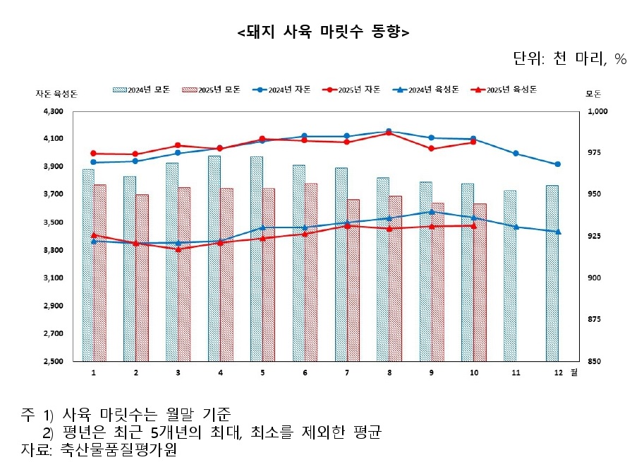 축산물품질평가원 이력제에 따르면, 10월 돼지 사육 마릿수는 1,200만 3천 마리로 전년(1,215만 8천 마리) 대비 1.3% 감소했으며, 평년(1,208만 5천 마리) 대비 0.7% 감소했다. 이 중 모돈 사육 마릿수는 94만 4천 마리로 전년(95만 6천 마리) 대비 1.3% 감소했다. 자돈 사육 마릿수는 전년(409만 8천 마리) 대비 0.6% 감소했고, 육성돈 사육 마릿수는 전년(353만 3천 마리) 대비 1.7% 감소했으며, 비육돈은 전년(344만 7천 마리) 대비 1.8% 감소했다.